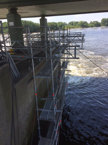 Sehr speziell das Gerüst am Wehr für die Elbbrücke der B404.
